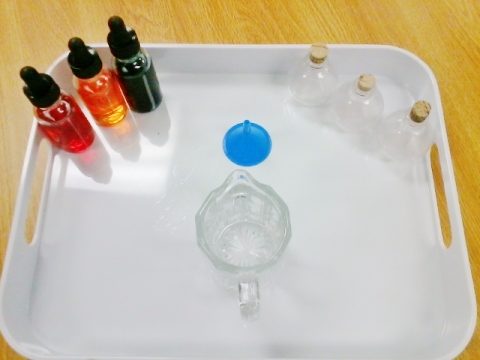 This activity can be presented to a group or individual child. Invite the child to the lesson (be mindful of the children who still need lessons in the initial eyedropper transfer and color mixing work). Show the child where the material is located on the shelf - practical life (high level of difficulty).